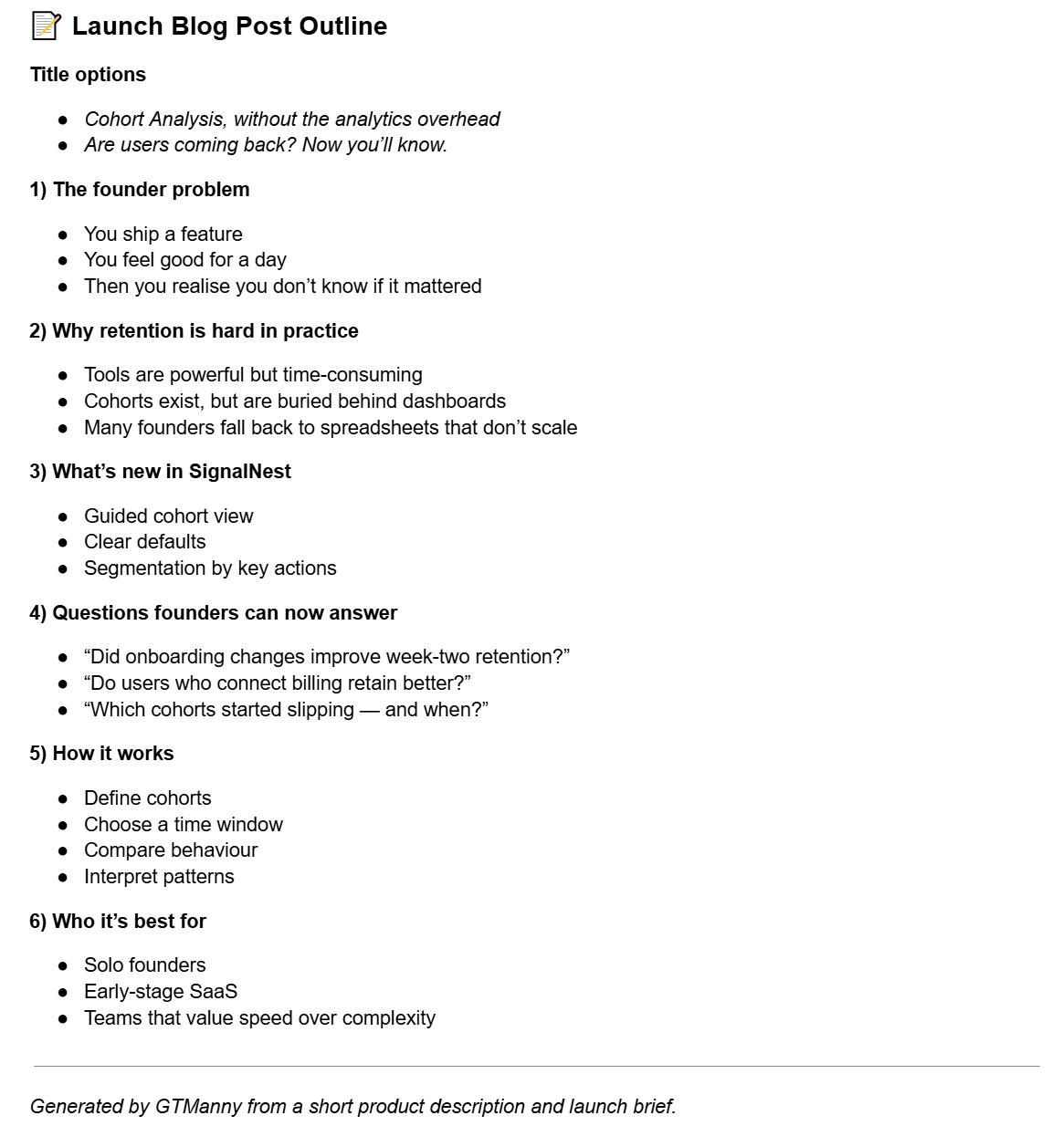 Paste what you shipped. GTManny turns it into a clear release note, FAQ, and launch summary you can share today.